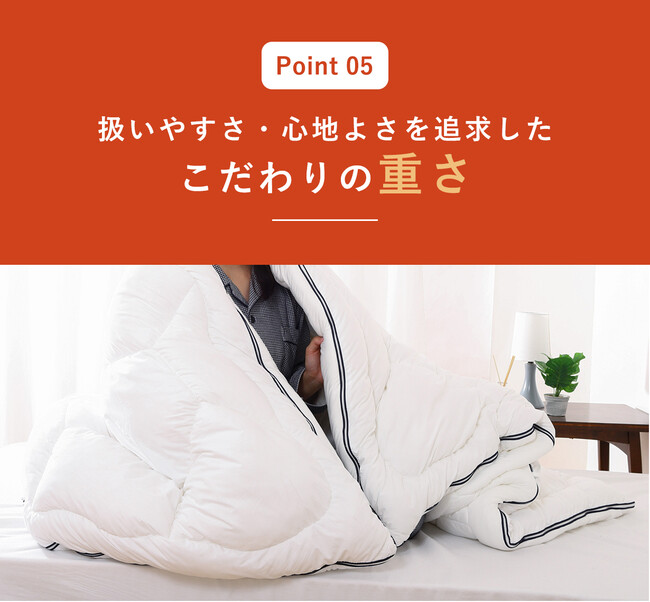 重い布団と軽い布団のメリットだけを良いとこどりした、ちょうど良い重さの2.2kgの充填量