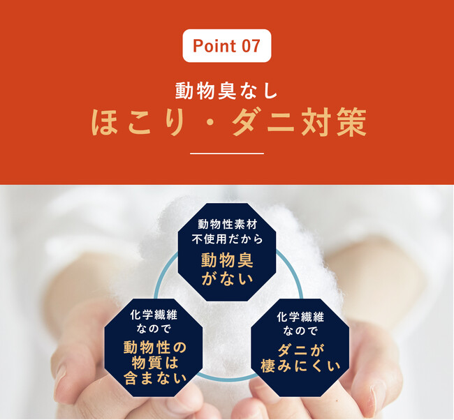 動物性素材を一切使用していないので、お肌が敏感な方でも清潔な就寝環境でおやすみいただけます。