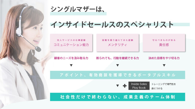 インサイドセールスの専門トレーニングを受けたシングルマザーが、完全在宅勤務で働き、プレイヤーとしてアポイント獲得・案件創出を支援することで、企業の利益に貢献します。