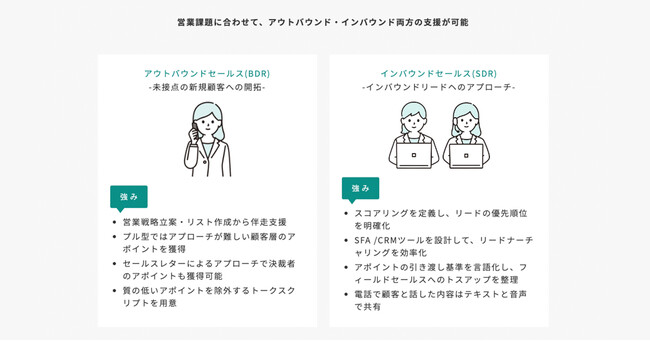 インサイドセールスの中でも、有力ターゲットの未接点顧客を開拓する「アウトバウンドセールス(BDR)」、展示会やWEB経由のリードから有効商談を生み出す「インバウンドセールス(SDR)」の両方において支援が可能です。