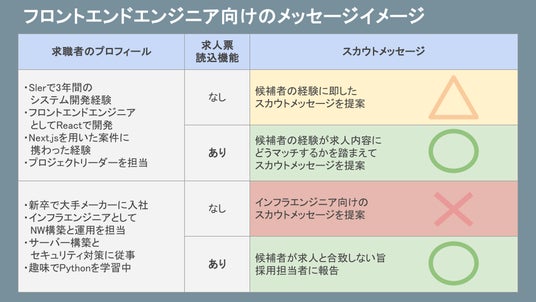 また、専門性が高くニッチな職種でも、AIが求人情報と求職者の経験・スキルを照らし合わせてスカウト対象になるかどうかを判断しやすくなるため、採用担当者の負担軽減と適正なスカウト判断を支援します。