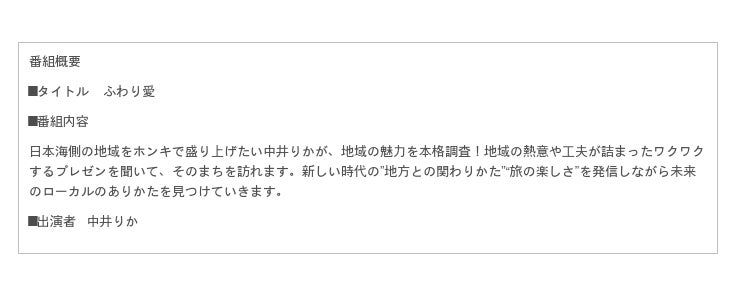 【株式会社チューリップテレビ(本社:富山県)、株式会社山陰放送(本社:鳥取県)、テレビ山口株式会社(本社:山口県)、株式会社秋田放送(本社:秋田県)、福井テレビジョン放送株式会社(本社:福井県)、株式会社山形テレビ(本社:山形県)、株式会社青森テレビ(本社:青森県)】で放送されている日本海側のテレビ局限定の『ふわり愛』