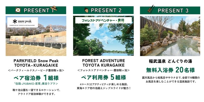 ・市公式Instagramで紹介された写真・動画の投稿者には、パークフィールドスノーピーク豊田鞍ヶ池のペア宿泊券などをプレゼントします。