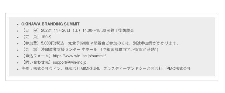 株式会社ウィン(札幌市中央区南2条西1丁目 1-2 代表取締役:勝山ヒロシ Tel.011-231-6543)は、11月26日(土)14時00分~18時30分に、沖縄産業支援センター 中ホール(沖縄県那覇市字小禄1831番地1)にて「OKINAWA BRANDING SUMMIT」https://www.win-inc.jp/summit/ を開催いたします。