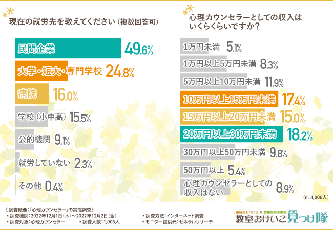 ・心理カウンセラーとしての収入として「20万円以上30万円未満」を得ていると判明。