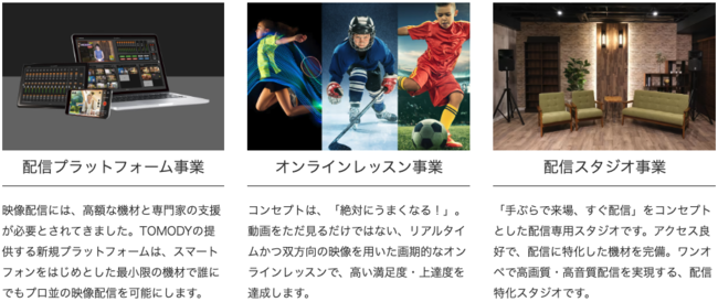 TOMODYは経営理念の「あらゆる体験をもっと身近に」を実現すべく世の中のニーズに適した「オンライン配信」を行うためのプラットフォームを提供致します。配信やオンラインレッスンに特化した配信プラットフォームを基盤として活用し、配信専用のスタジオの運営やオンラインレッスンの事業展開も行っております。