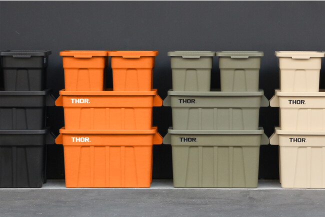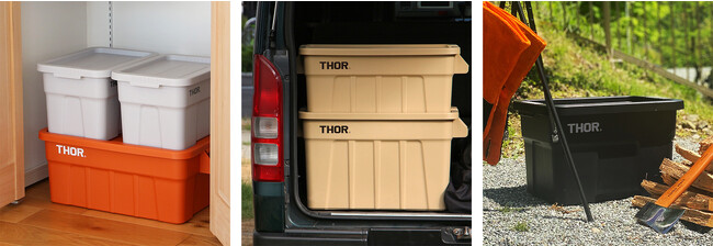 収納コンテナである THOR LARGE TOTE DC は、部屋の中では洋服収納やおもちゃ入れとしてはもちろ ん、食品や飲料のストック保管用にも使いやすく、アウトドア派は車に積んでキャンプギアを運んだり、 洗車アイテム等車まわりの備品を収納したりと、場所や用途を選ばずすっきりと収納することができ ます。詳細な製品仕様についてはこちら。(https://topics.detail.co.jp/thor-new/)