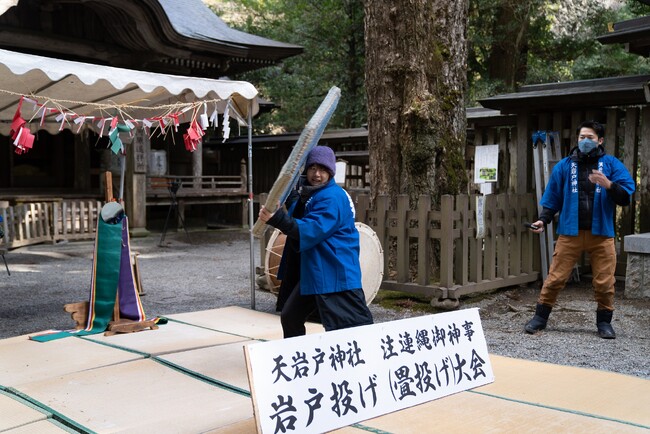 また、『天岩戸注連縄張神事』は、かつて天岩戸神社で行われていた畳を投げる「岩戸投げ大会」を今年も開催します。「岩戸投げ大会」は、天岩戸伝説の中で、天照大御神(あまてらすおおみのかみ)がお隠れになられた天岩戸をこじ開けた力の神様・手力男命(たぢからをのみこと)に由来するものです。手力男命が投げ飛ばした岩戸は、長野県の戸隠に飛ばされ戸隠山になったと伝えられており、この岩戸を模して重さ約20Kgの畳を投げ、その距離を競うもので、どなたでもご参加いただくことができます。