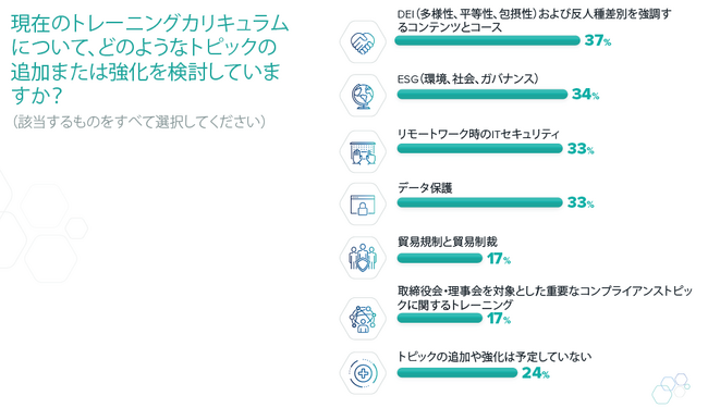 コンプライアンス研修のカリキュラムの重要分野として、グローバル全体では、「ITセキュリティ」、「ESG」、「データ保護」が挙がっていましたが、日本では「DEI(多様性、公平性、包括性)」、「ESG」、「ITセキュリティ」が研修内容として優先されており、現在、日本企業が推進している分野の内容が挙がりました。