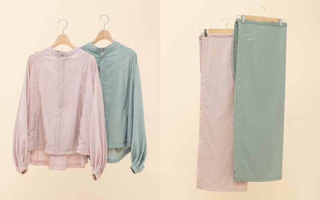 二部式構造のEMOUは、セットアップはもちろん、ジャケットまたは裾よけ単品の着用も可能です。