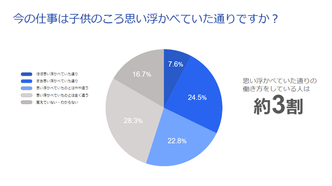 また、「子供の頃思い浮かべていた通りの職業・働き方をしているか」という問いに対し、「ほぼ思い浮かべた通り」と回答したのは7.6%、「まあ思い浮かべた通り」と回答したのは24.5%という結果をみてみると、子供の頃思い浮かべた通りの職業・働き方をしている人は全体の約3割にとどまっていることがわかります。引用:「雑誌『起業時代』大人の過去の夢・未来の夢 「なりたい仕事と起業」についての調査を公表」(https://corp.freee.co.jp/news/20230118kigyouzidai.html)