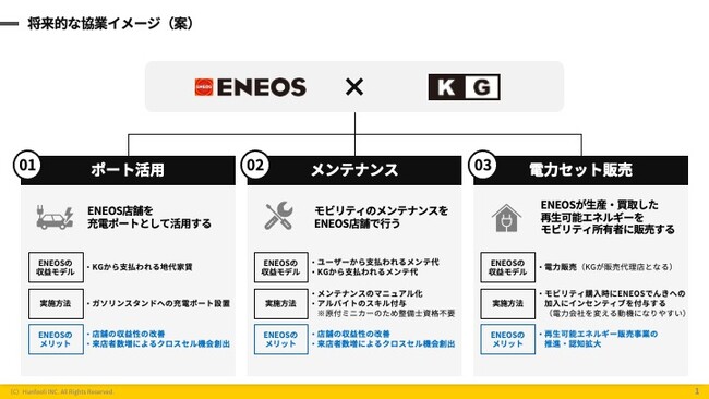KGモーターズでは「モビリティの小型化による脱炭素社会の実現」を目指しております。一方、ENEOS ホールディングスでは「スタートアップとの共創活動により、クリーンなエネルギーを活用したモビリティステーションの構築」を目指しております。