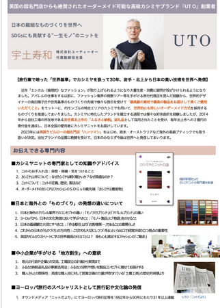 岩手県北上市の自社工場で「高級カシミヤニット」をつくる株式会社ユーティーオー(以下、UTO)(本社:東京都港区、代表取締役:宇土壽和)は、日本のカシミヤニットブランドとして初めてロンドンのスーツ発祥の地・サヴィルロウの超名門店の高級紳士服店・ハンツマン(https://www.huntsmansavilerow.com/)にて来年より取扱いすることが決定しました。