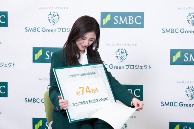 続いて、1年間のWeb通帳の口座増加数が「約74万」件であったことを発表。山下が「紙通帳1冊の厚みは0.3cmなので、積み上げると全部で約2,200mの高さになります。これは、吉高支店長1,400人分くらいの高さですね。」とコメントし、吉高さんは驚きの表情を見せるとともに、「それだけ環境に貢献したという事で、素晴らしいことだと思います。」とコメント。