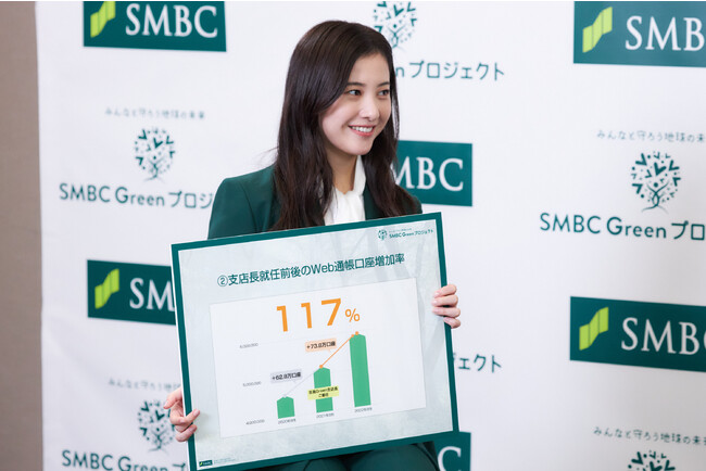 続いて、「吉高Green支店長就任前後でのWeb通帳口座の増加率」について、117%伸長したことを発表。山下が「ここ数年Web通帳口座数自体は順調に伸びていましたが、吉高支店長の就任後は伸びが顕著です。吉高支店長の効果が、ちゃんと数字にも表れる結果となりましたね。」と述べ、吉高さんが「皆様のおかげです。ちゃんと結果が表れて嬉しいです。」と喜びの表情を見せました。