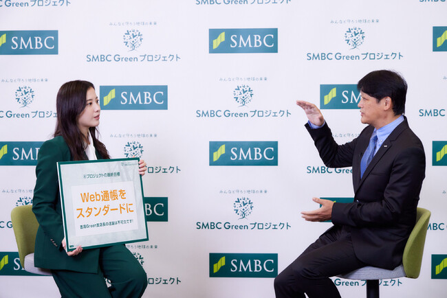 「SMBC Greenプロジェクト」は、環境負荷軽減に向けた意識をお客さまと共有し、ともに取り組んでいくことを目的として2021年9月に発足されました。年間400万冊以上発行してきた紙資源の使い方を見直す一環として、Web通帳の機能拡充や、インターネットバンキング「SMBCダイレクト」のリニューアル、店頭お手続のデジタル化等、これまでの窓口やATMでのお取引に加え、デジタルサービスの拡充を行うことで、お客さまの利便性を高めつつ、資源の削減を進めてきました。