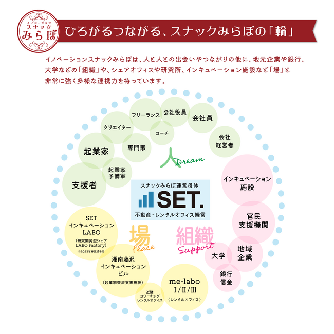 さらにイノベーションスナックみらぼは、地域企業や銀行、大学などの「組織」や、コワーキングスペースやシェアオフィス、研究所やインキュベーション施設などの「場」と非常に多くの連携力を持っております。