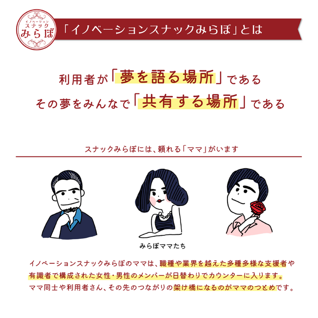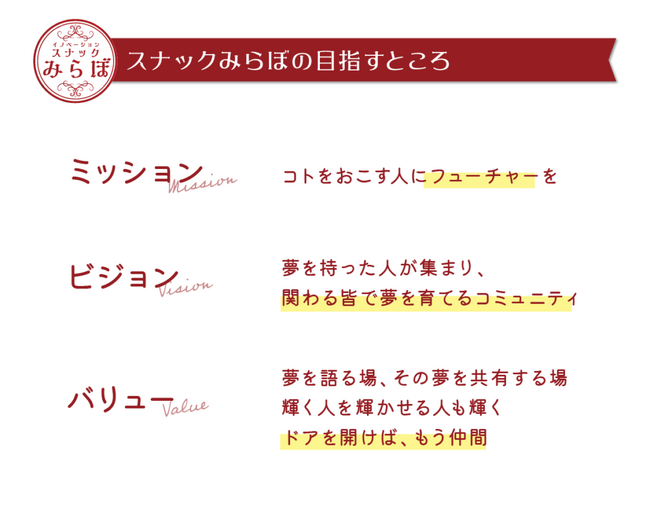 この想いを大事にして、イノベーションスナックみらぼに関わってくれる人たちと一緒に、皆様と人生を豊かにしていきたいと思います。これからもイノベーションスナックみらぼを一緒に盛り上げていただけましたら幸いです。