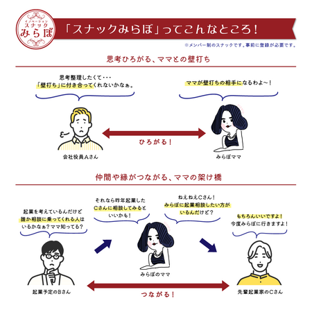 ションマネジャーやメンター、先輩起業家が日替わりママとしてカウンターに立ち、相談に訪れる起業家の事業アイディアの壁打ちを行ったり、資金調達の相談でクラウドファンディングの支援や金融機関などを繋いだり、起業家同士や地域企業の連携の機会づくりを行う施設です。