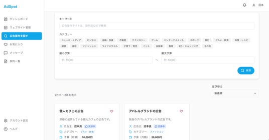 ウェブサイトの検索カテゴリーと予算で絞り込める検索機能。ターゲット層に合った最適な広告枠を素早く見つけられます。