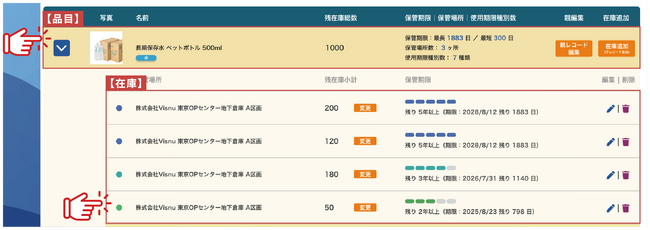 VisnuBCPでは5年以上から1年以下の賞味・消費期限を5段階で区分しリスト表示することで、オンライン上で容易に状態を確認することが可能です。