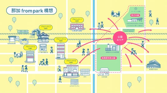 各務原市のまちなかウォーカブル推進事業では、「公園の賑わいをまちなかへ」というコンセプトのもと「那加from Park構想」を掲げ、各務原市や地域のプレイヤーと協働しさまざまな取り組みを仕掛け始めています。