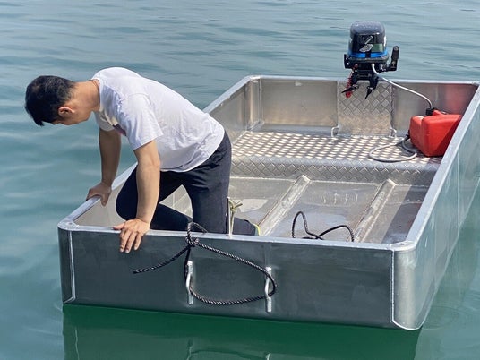 海苔漁の大型船には、一般的に作業船が一つ以上積み込まれています。特に明石の海苔漁では、これらの作業船が重要な役割を果たしています。 この作業船は、オールアルミ製で製作されています。アルミは軽量かつ耐久性があり、海洋環境にも強く、長時間の使用に耐えることができます。また、作業船の設計は漁師の作業効率や体の負担を考慮したものです。