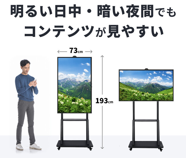 55インチの大型サイズ、2,500cdの高輝度パネルを使用しており、その明るさは通常のテレビの約6~7倍の明るさがある為、ショーウィンドウ等の直射日光が当たる明るい日中でも非常に見やすくなっています。(本デバイスは屋内使用限定です)