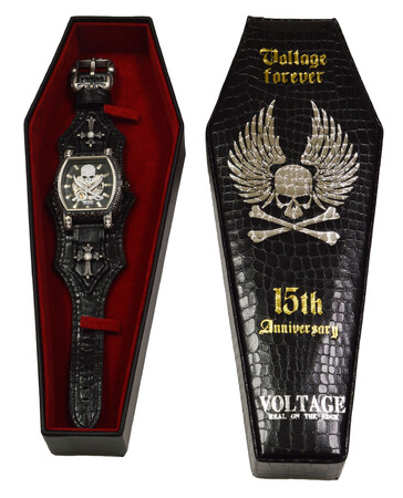 時計に付属するボックスは、限定100個のみの特別仕様です。コフィン(棺型)のボックスの表には、「15th Anniversary」「Voltage Forever」のゴールドの文字とシルバーのウィング・スカルが刻印されています。クロコ型押しレザーを使用し国内で作製、小物入れとしても使用できます。