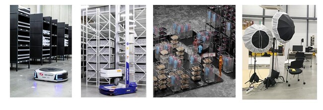 ▼導入設備のイメージ(左より、棚搬送ロボット・ACR・Cuebus・撮影スタジオ)