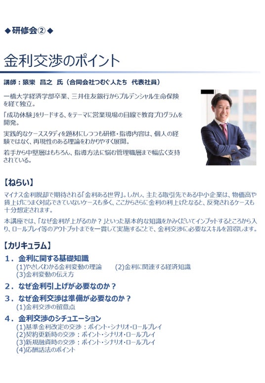 研修 「金利交渉のポイント」概要ロールプレイや講師による実演を中心とした実践型の講座で、応酬話法や、上司との連携による交渉も含みます。