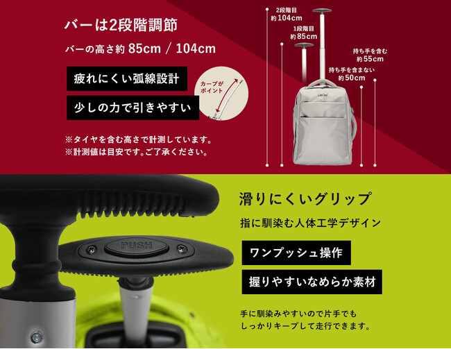 キャリーバーは少しの力で引きやすく疲れにくい弧線設計。また、手に馴染んで滑りにくいグリップなど、人体工学に基づいたデザインで体の負担を軽減します。
