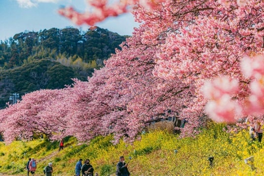 「河津桜」の誕生の地である静岡県賀茂郡河津町で開催される「河津桜まつり」は、毎年、全国からたくさんの観光客が集まる伊豆の一大イベント。町内を流れる河津川沿いに植えられた約850本の河津桜が咲き乱れ、同じ時期に川沿いに植えられた菜の花も開花。河津桜の濃いピンク色と、菜の花の黄色の花との共演は、訪れる人の心を魅了します。