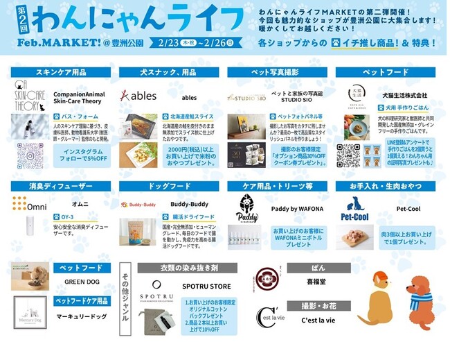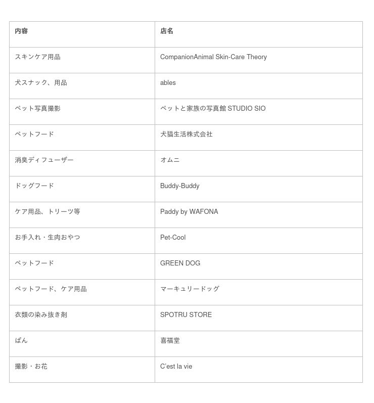 ●Companion Animal Skin-Care Theory(スキンケア用品) ●ables(犬スナック、用品)●ペットと家族の写真館STUDIO SIO(ペット写真撮影) ●犬猫生活株式会社(ペットフード) ●マーキュリードッグ(ペットフード、ケア用品) ●Buddy-Buddy(ドッグフード) ●Paddy by WAFONA(ケア用品・トリーツ等) ●SPOTRU STORE(衣類の染み抜き剤) ●C’est la vie(撮影・お花) ●喜福堂(ぱん)