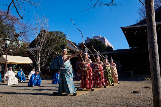小笠原教場による弓始めの儀式「新春弓始め三々九手挟式」は古式ゆかしい武家の作法で奉納されます。