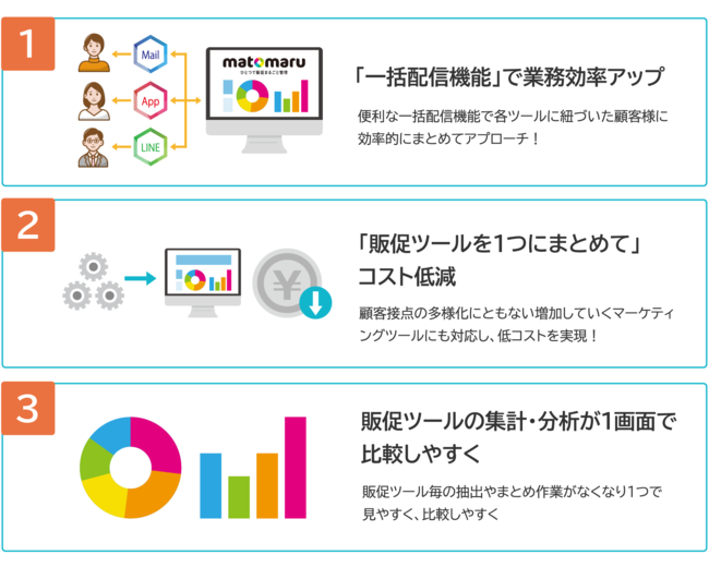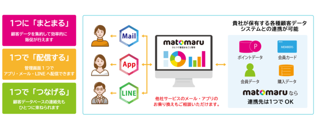matomaruは、“ひとつで販促まるごと管理”をコンセプトとし、このような顧客の購買履歴や属性データ、広告配信データなど、様々なデータを活用される店舗・企業の課題解決をサポートいたします。