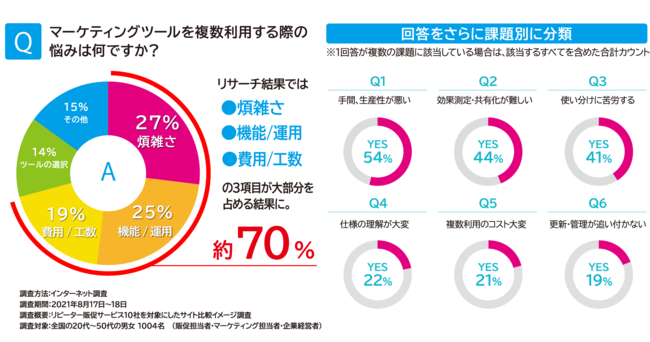 新型コロナウイルス感染拡大を背景に、顧客の購買行動のオンラインシフトが進んだことで、顧客に関するオンラインデータが充実してきた反面、マーケティングツールを複数ご利用される店舗・企業の課題も拡大しており、バリューワンが行ったリサーチ結果では、マーケティングツールを複数利用する店舗・企業では、「煩雑さ」、「機能/運用」、「費用/工数」といった3項目の課題が約70%を占めていることが分かりました。