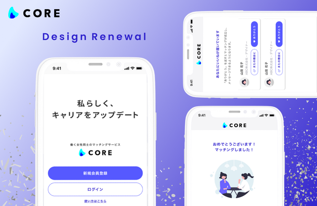 株式会社CORE(本社:東京都渋谷区 代表取締役:尾崎莉緒)は、このたび女性向けキャリアマッチングサービス「CORE」の全面デザインリニューアルを2023年5月9日(火)に行いました。