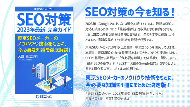アドマノ株式会社(本社:東京都豊島区、代表:天野 剛志)が提供するSEO専門サービス「東京SEOメーカー」は、2023年1月22日(日)に書籍「東京SEOメーカー2023年最新SEO対策完全ガイド」を刊行しました。長年培った確かなノウハウと技術をもとに、2023年時点のSEOを徹底解説。基礎から実践まで、SEO対策に関する情報や独自技術、SEOの問題を解決に導く解決Q&Aなどを1冊にまとめました。
