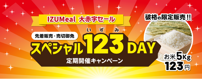IZUMealの目玉のひとつとして、1商品123円の数量限定超特価キャンペーン(お1人様1点限り)を不定期開催いたします。リニューアルオープン後、記念すべき第一回のスペシャル123DAY対象商品は国産コシヒカリ5kg。123点の数量限定でご提供し、大盛況ののち即日完売いたしました。