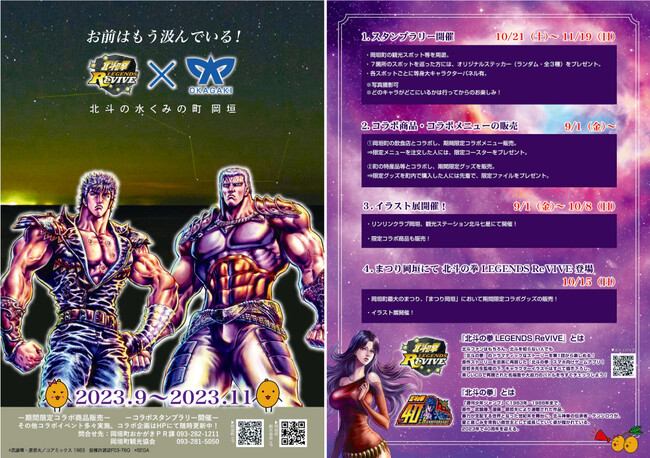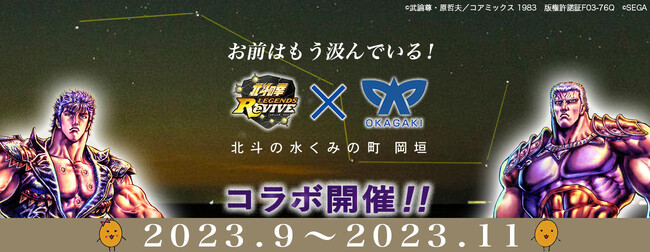 福岡県遠賀郡岡垣町では、2023年9月から11月にかけて、株式会社セガのスマホゲーム「北斗の拳 LEGENDS ReVIVE」とコラボレーションし、北斗の拳ファンやリバイブファン、観光客の皆様に楽しんでいただけるようなさまざまな企画やイベントを行います。