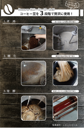 今回そんな「ことことビール」と開発したコーヒービール「Tobira」では、煮沸、糖化、発酵の3つの工程で「Doors」が誇るスペシャルティコーヒーを使用することとなりました。一般的なスタウト(黒ビール)は焙煎した大麦(チョコレートモルト)を使用するため、しっかりとした重みがあり、ドライで苦味のある味わいが特徴的ですが、今回私たちが作るコーヒースタウトはチョコレートモルトを使用せず、コーヒー屋としてのこだわりをビール作りに存分に注入し、コーヒーが持つ風味と色味を最大限に活かすため、徹底して豆にこだわる手法を取りました。