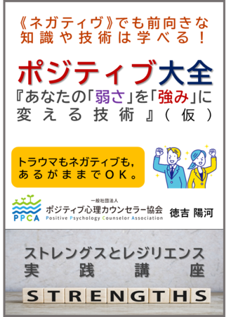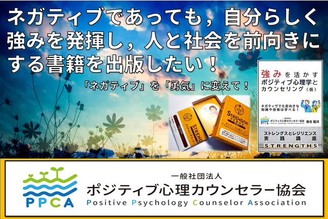 一般社団法人ポジティブ心理カウンセラー協会(本社:東京都港区,理事・講師:徳吉陽河)は,著作となる「ポジティブ大全」(あなたの「弱さ」を「強み」に変える技術(仮))の出版に向けて,クラウドファウンディングを行うことになりましたことをお伝えいたします。感謝を含め,強み(ストレングス)に関わるカードなど期間限定のリターンを多数ご用意。