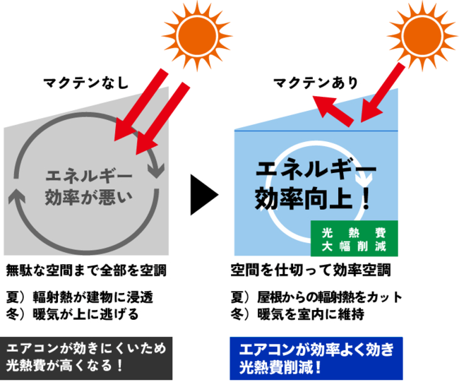 屋根からの熱を遮断し、必要な部分のみに空間を仕切ることで空調効率の大幅な改善につながります。マクテンは季節や天気を問わず長年にわたって節電効果続くため、設置の際の初期投資費用が早期回収されるケースもあります。