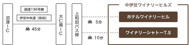JR 三島駅から伊豆箱根鉄道で修善寺駅まで30分。修善寺駅からホテルワイナリーヒルへはタクシーで10分。中伊豆ワイナリーシャトーT.S.へはタクシーで15分。