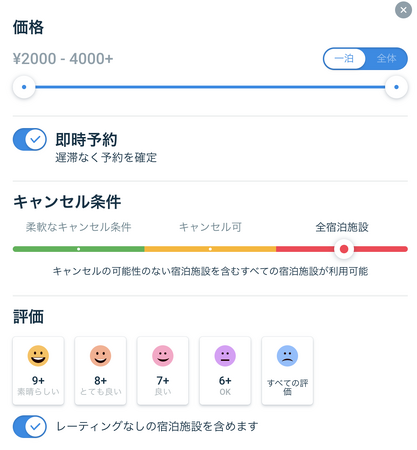 cozycozyでは、お客様が簡単に予算やキャンセル条件に合った宿泊施設を見つけられるよう、検索オプションを充実させています。予算に合わせて価格帯を絞り込んだり、フレキシブルなキャンセルポリシーや返金条件を選択することで、お客様は安心して予約ができます。