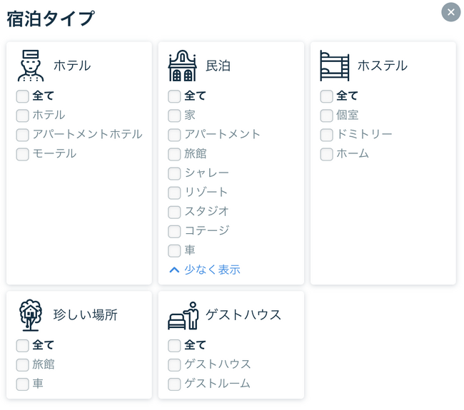 お客様は約20種類の宿泊タイプからニーズに適した最適なホテルや宿泊施設を簡単に見つけることができるようになります。