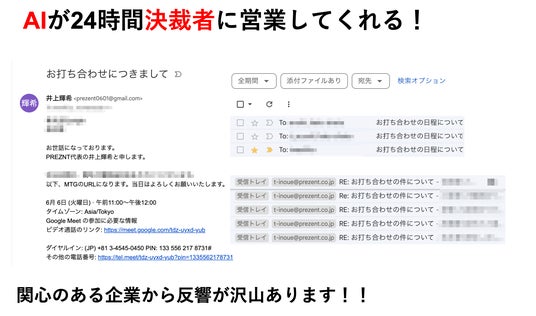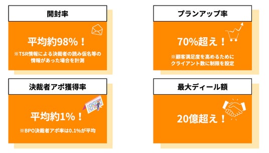 今までアプローチが出来なかった企業の上役に貴社の想いを届けます。1.AIが働く2.決裁者に刺さるメールを直接送れるため、今までの営業代行の常識を大幅に変えるパフォーマンスを叩き出します。また小規模事業者様には、完全成果報酬にしており業界初の最低保証を実装しております。