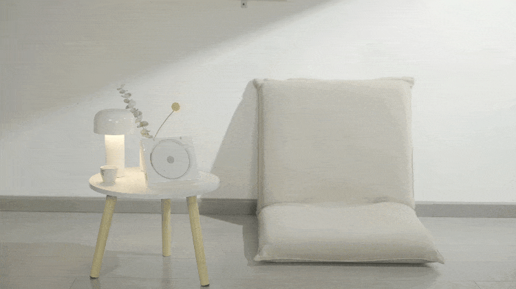 白基調とグレーの配色で、SPLITの背面には折り畳みのできるスタンドがついており、場所を選ばずに置くことができます。4つのボタンと1つの回旋ノブのみですべての操作が完結されます。