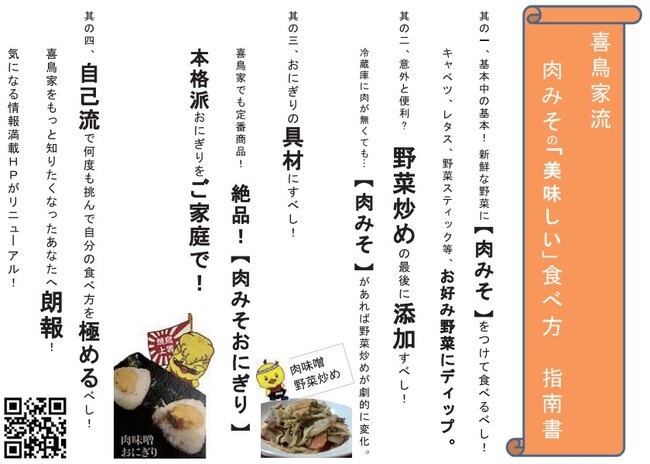 しかしこれまで、この「日本一おいしい肉みそ」は、兵庫県内に8店舗ある喜鳥家の店頭か、地元兵庫県のスーパーでしか入手できない幻の逸品でした。この度、当社では喜鳥家の監修を受け、世界で初めてこの「日本一おいしい肉みそ」のネット販売を開始しました。キャベツにディップして楽しむほか、野菜炒めやおにぎりの具材などに使える、万能調味料としてお使いいただけます。